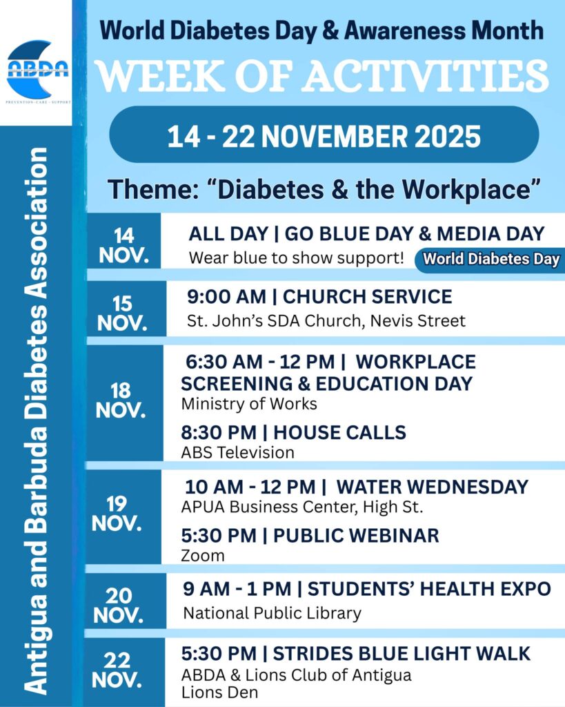 The Antigua and Barbuda Diabetes Association (ABDA) joins the global community in recognizing World Diabetes Day and Awareness Month under the theme “Diabetes and Well-Being,” with a 2025 focus on “Diabetes and the Workplace.”